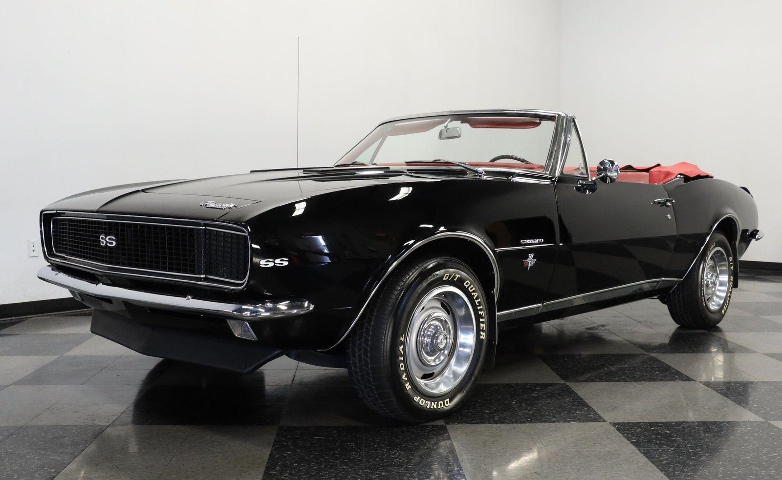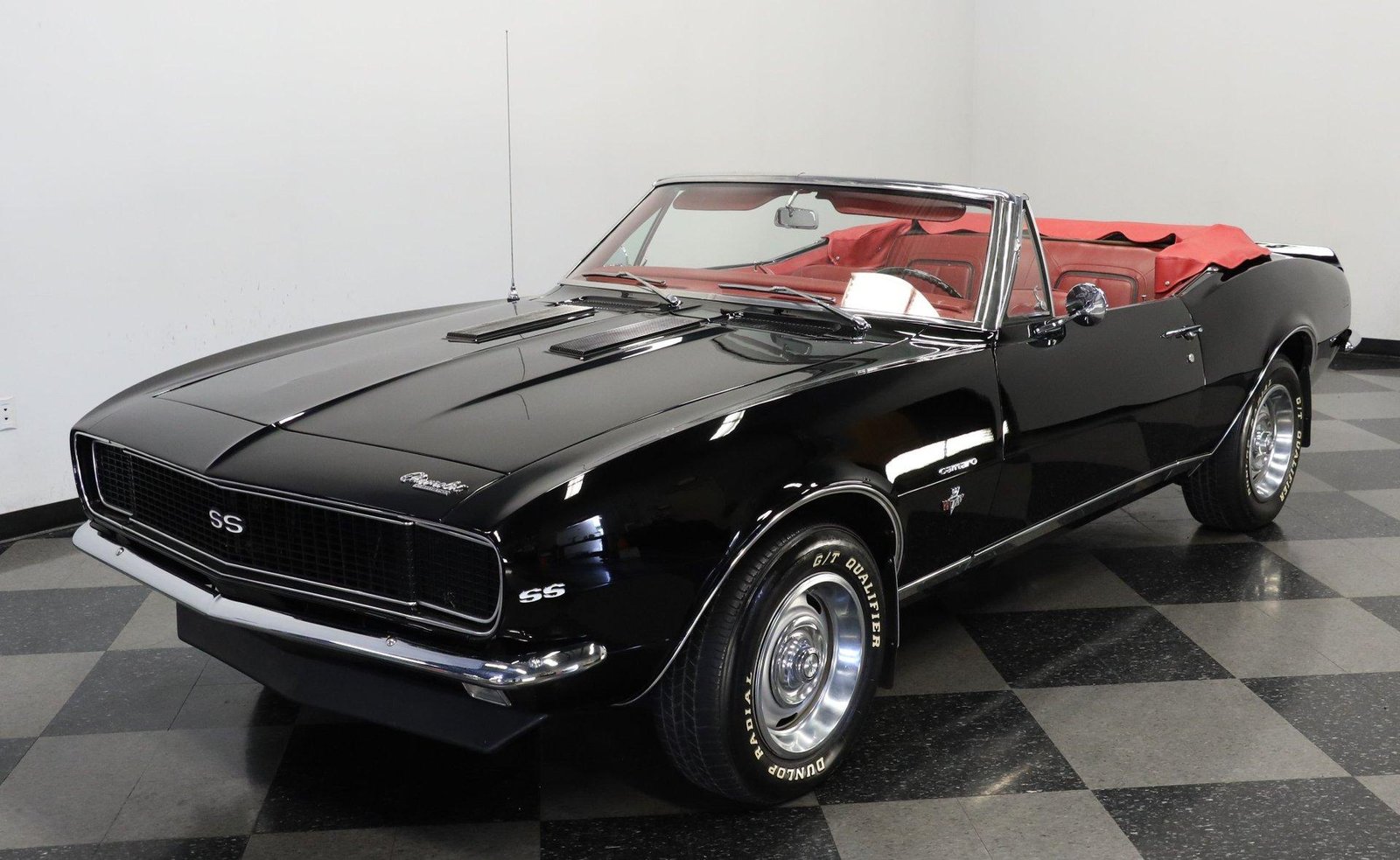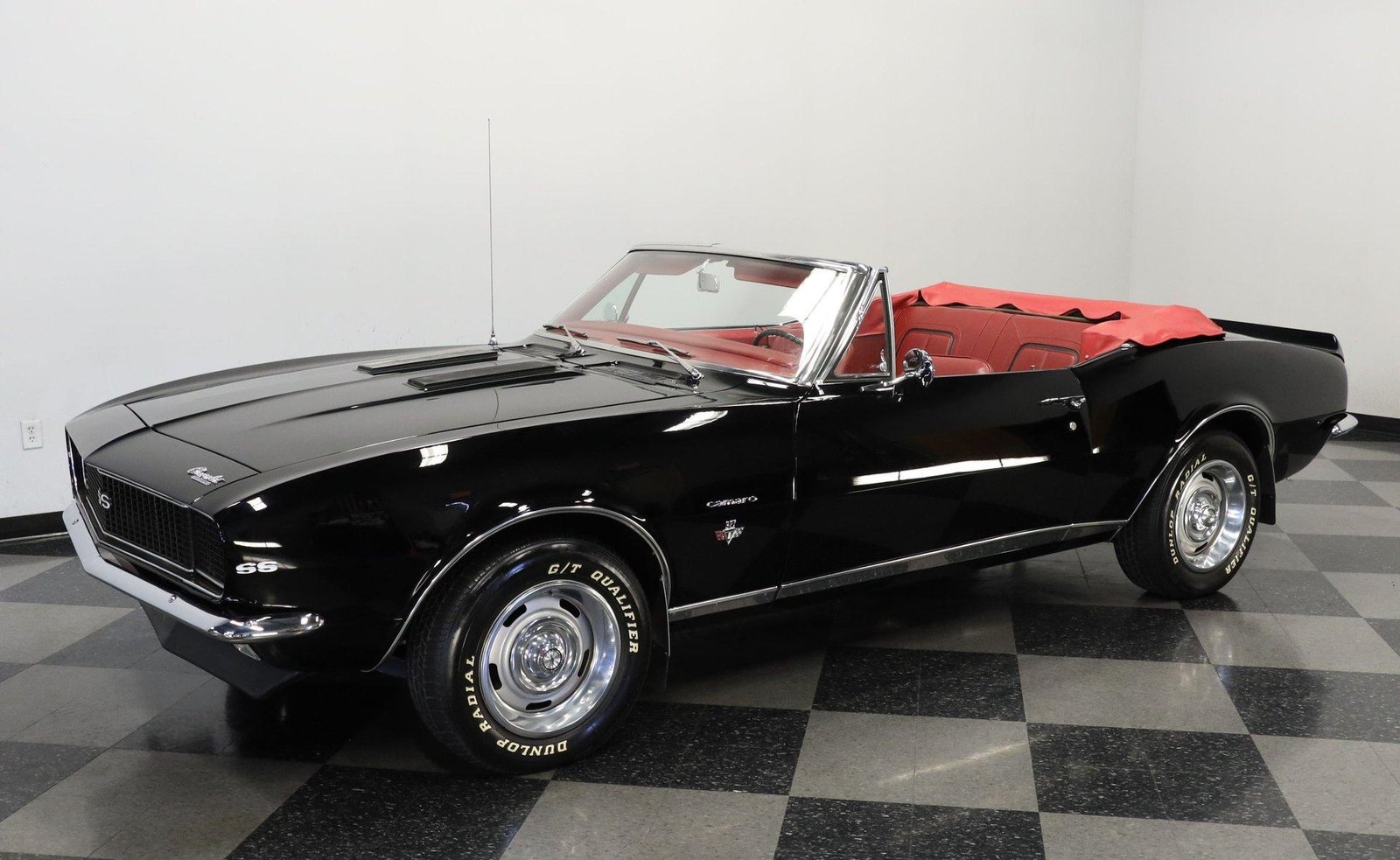 A stunning 1967 Chevrolet Camaro RS Convertible finished in Tuxedo Black with red interior — powered by a year-correct 327 V8 and 4-speed manual, combining authentic first-gen style with true American muscle performance.