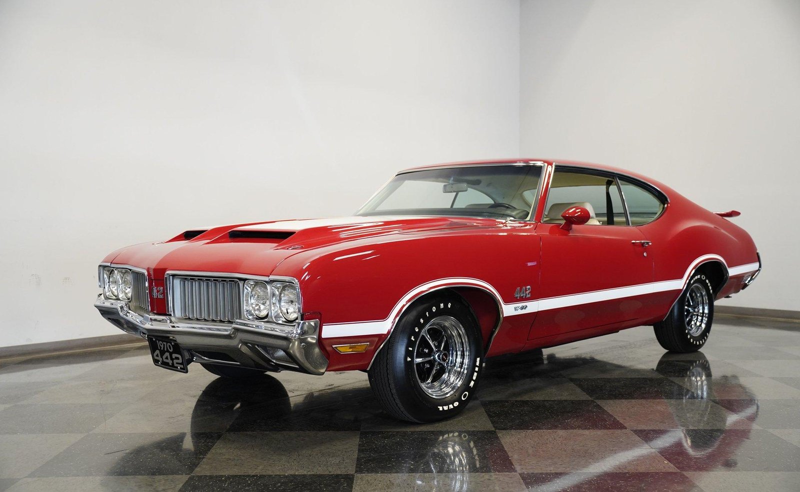 Authentic 1970 Oldsmobile 442 W-30 with period-correct 455 V8, 4-speed manual, Ram Air, power steering, and front discs. Stunning red finish with white stripes — a true muscle icon.