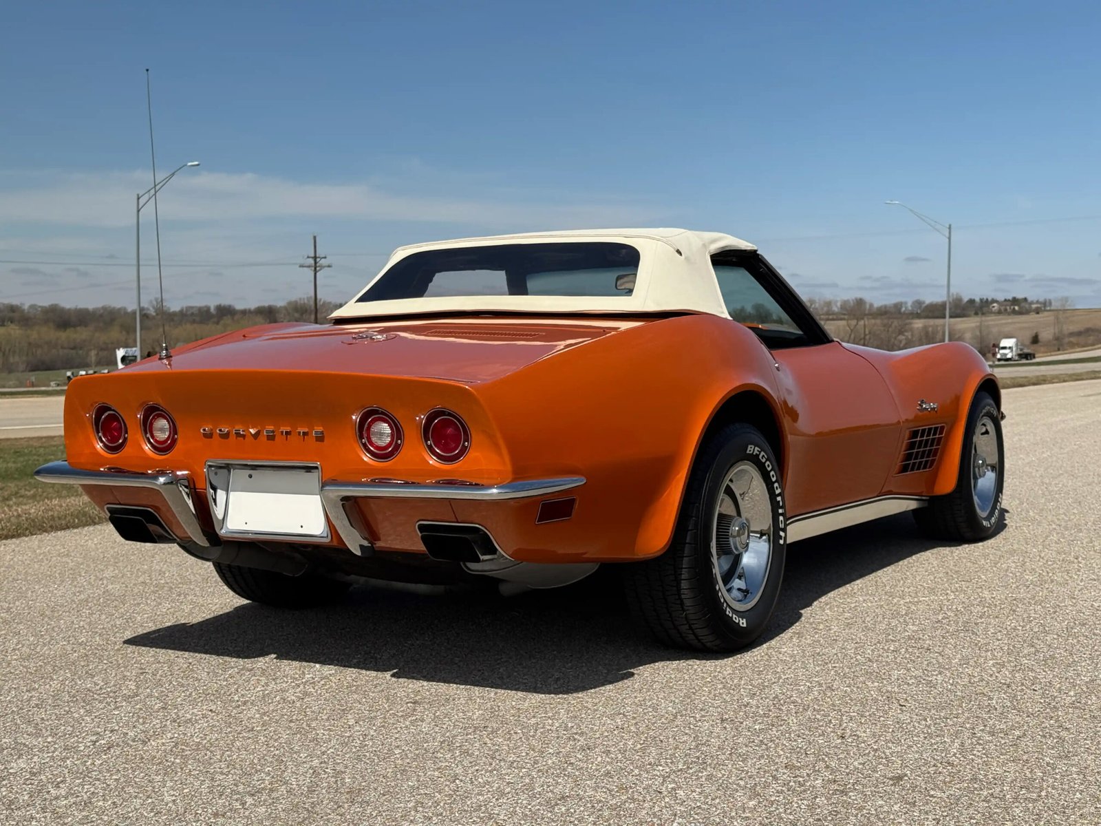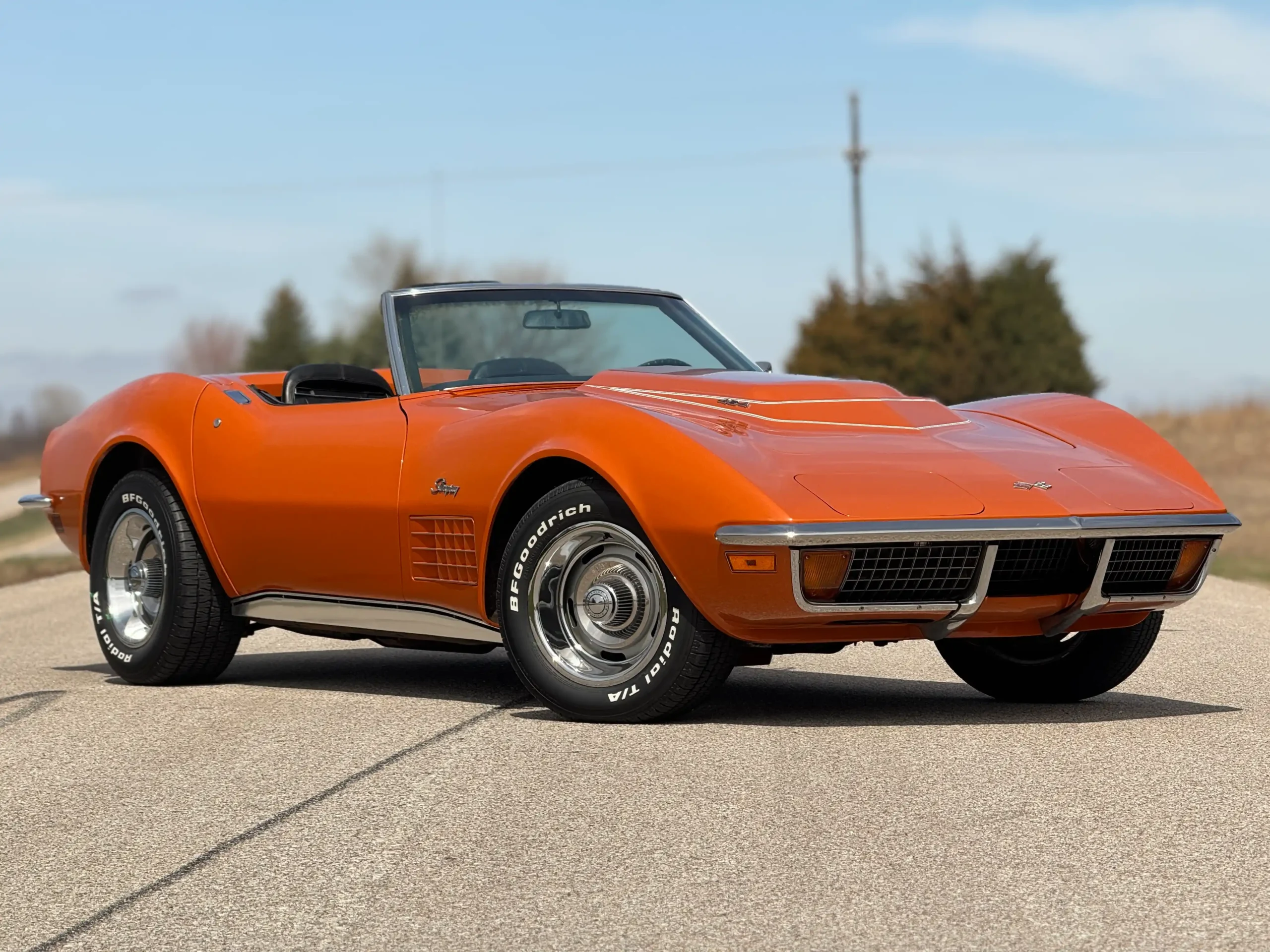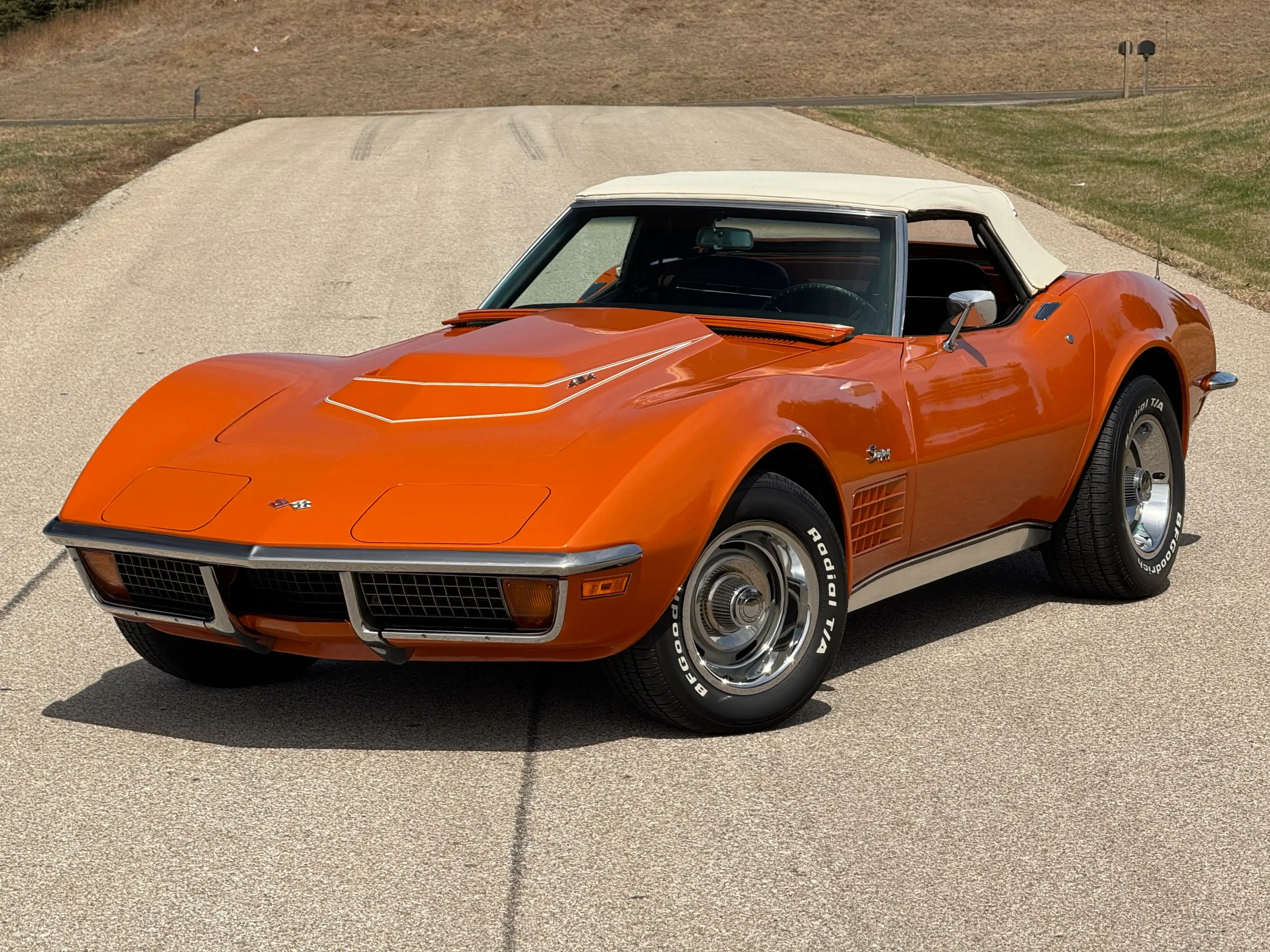 Exterior: Striking Ontario Orange paint, chrome bumpers, color-matched removable hardtop, and 15×8 Corvette Rally wheels wrapped in BFGoodrich Radial T/A tires (245/60R15), delivering a bold and authentic muscle-era presence.