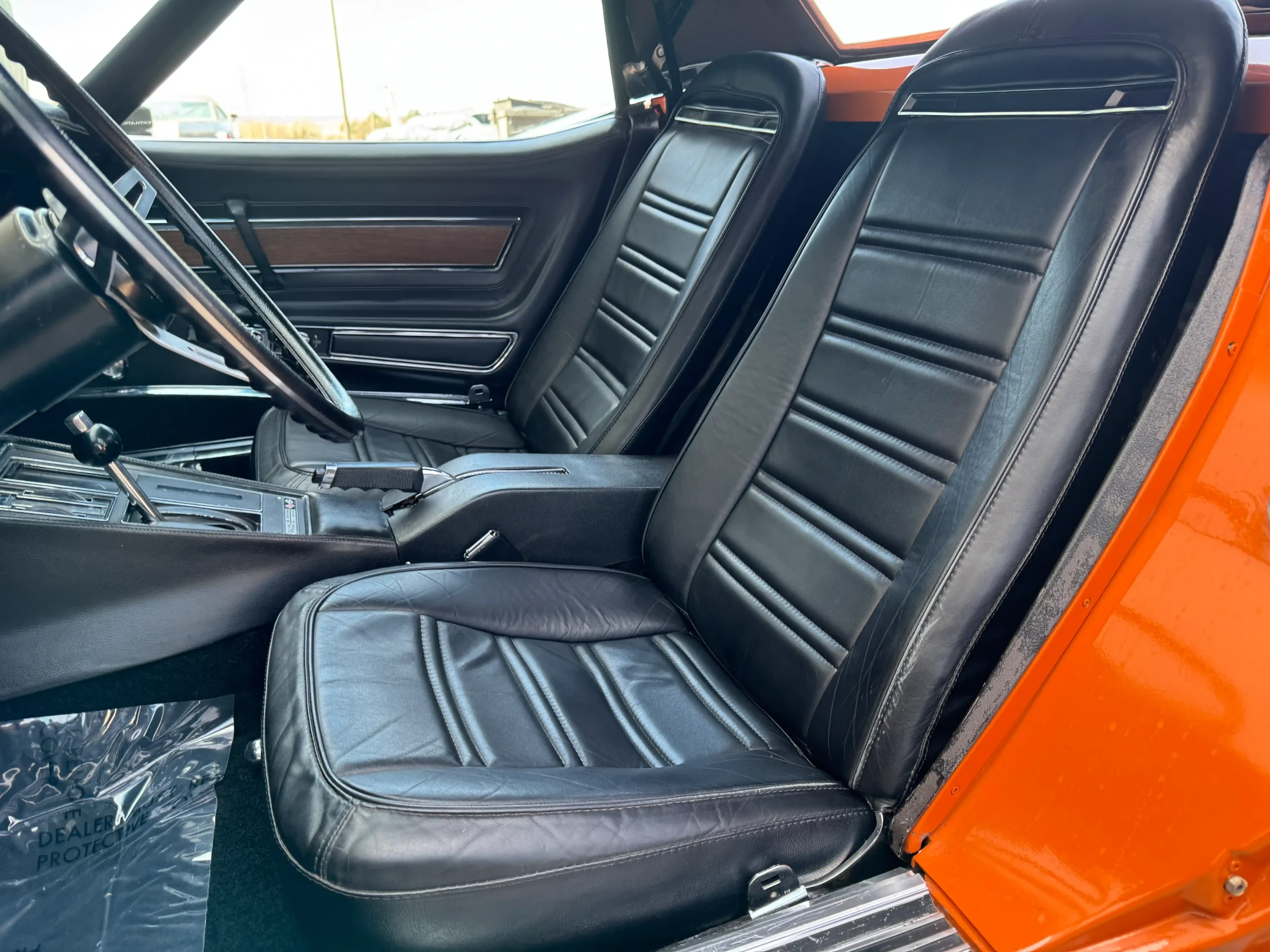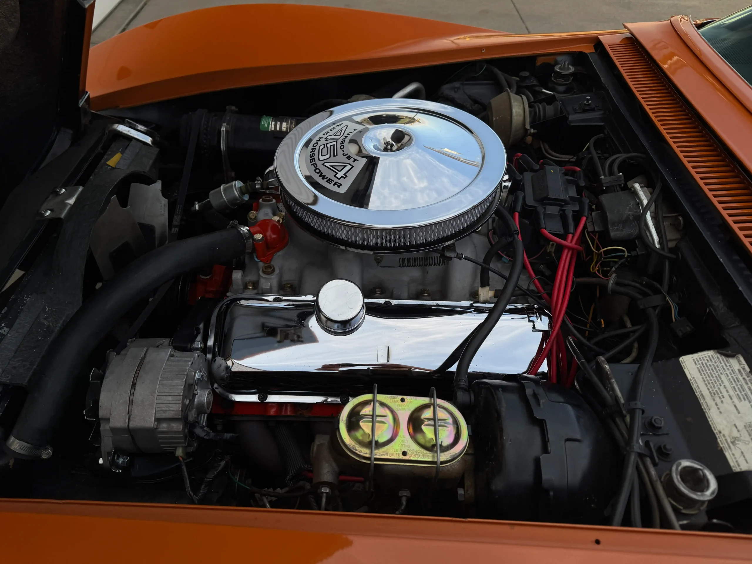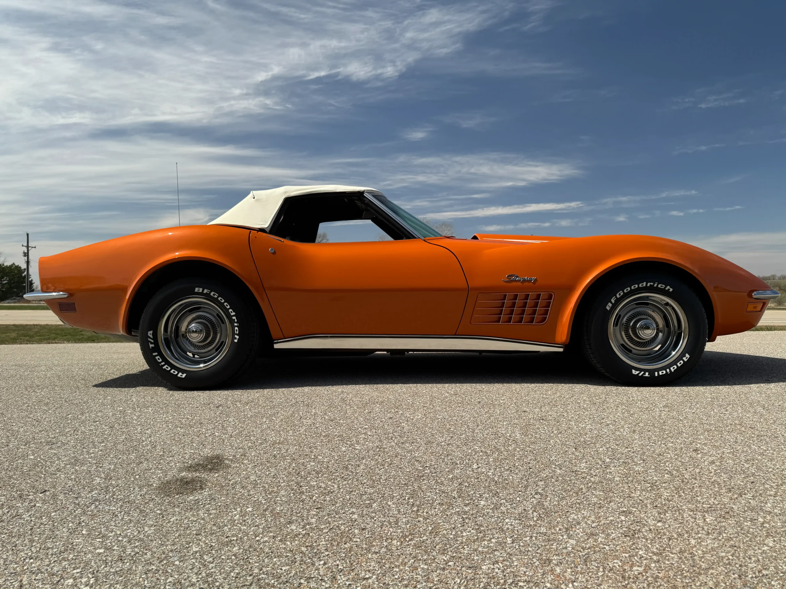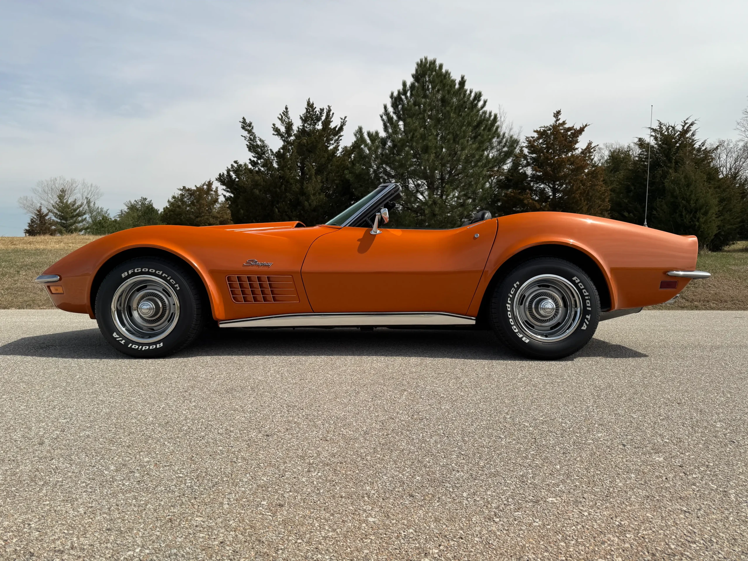 Exterior: Striking Ontario Orange paint, chrome bumpers, color-matched removable hardtop, and 15×8 Corvette Rally wheels wrapped in BFGoodrich Radial T/A tires (245/60R15), delivering a bold and authentic muscle-era presence.
