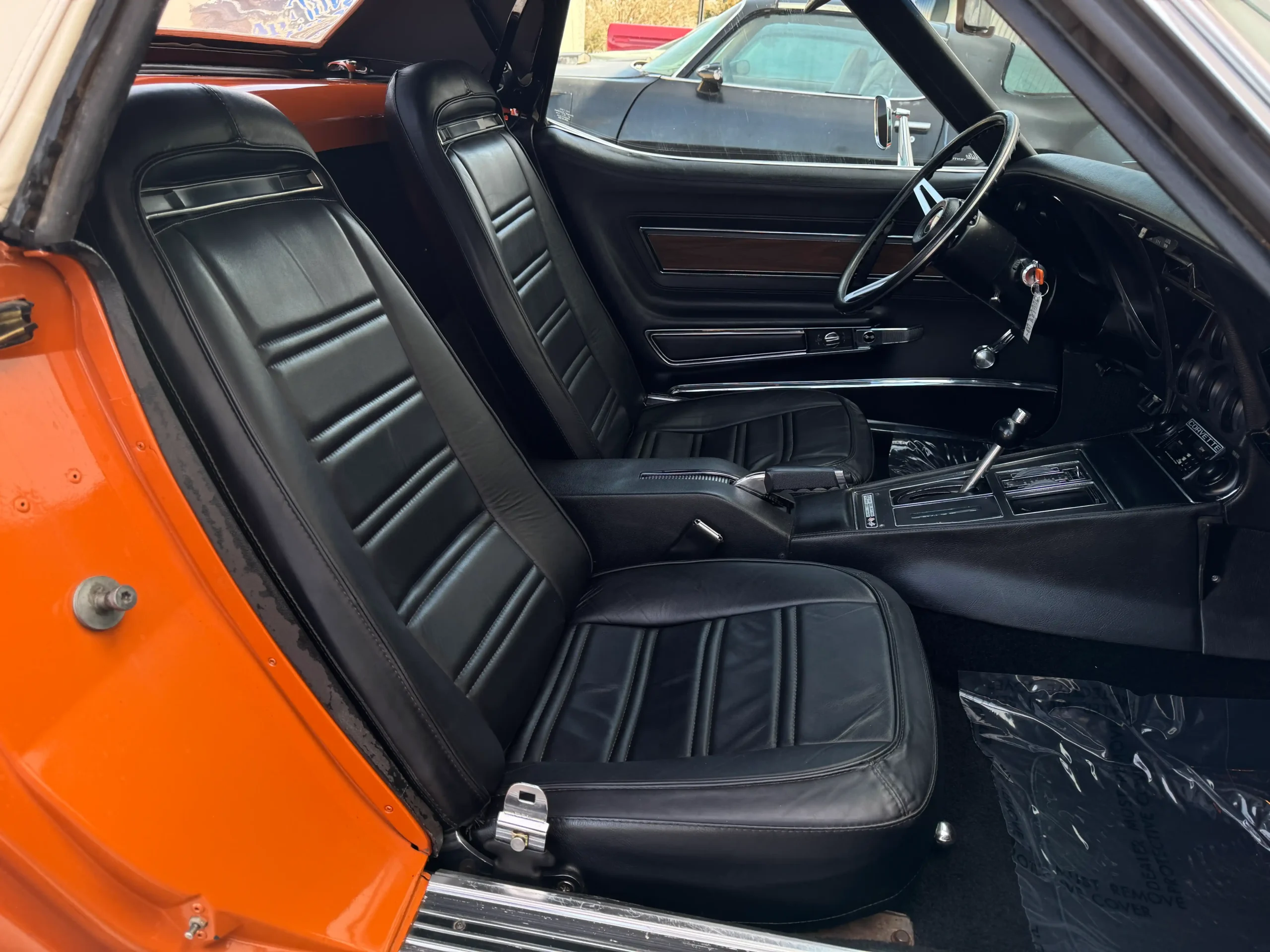 Interior: Black deluxe leather interior with tilt steering column, full gauge package, and factory air conditioning, offering classic Corvette style with premium comfort.